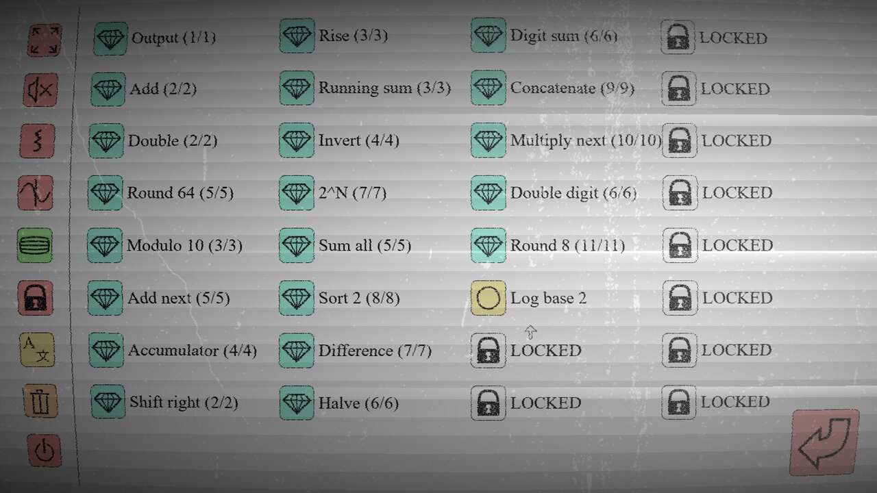 1-DC is an open-ended programming puzzle game (a "zach-like"), featuring a fictional low-level programming language. There are only three base commands; the rest depends on the commands' parameters (somewhat like SIC-1). This challenges the player to think in abstract and minimal terms.