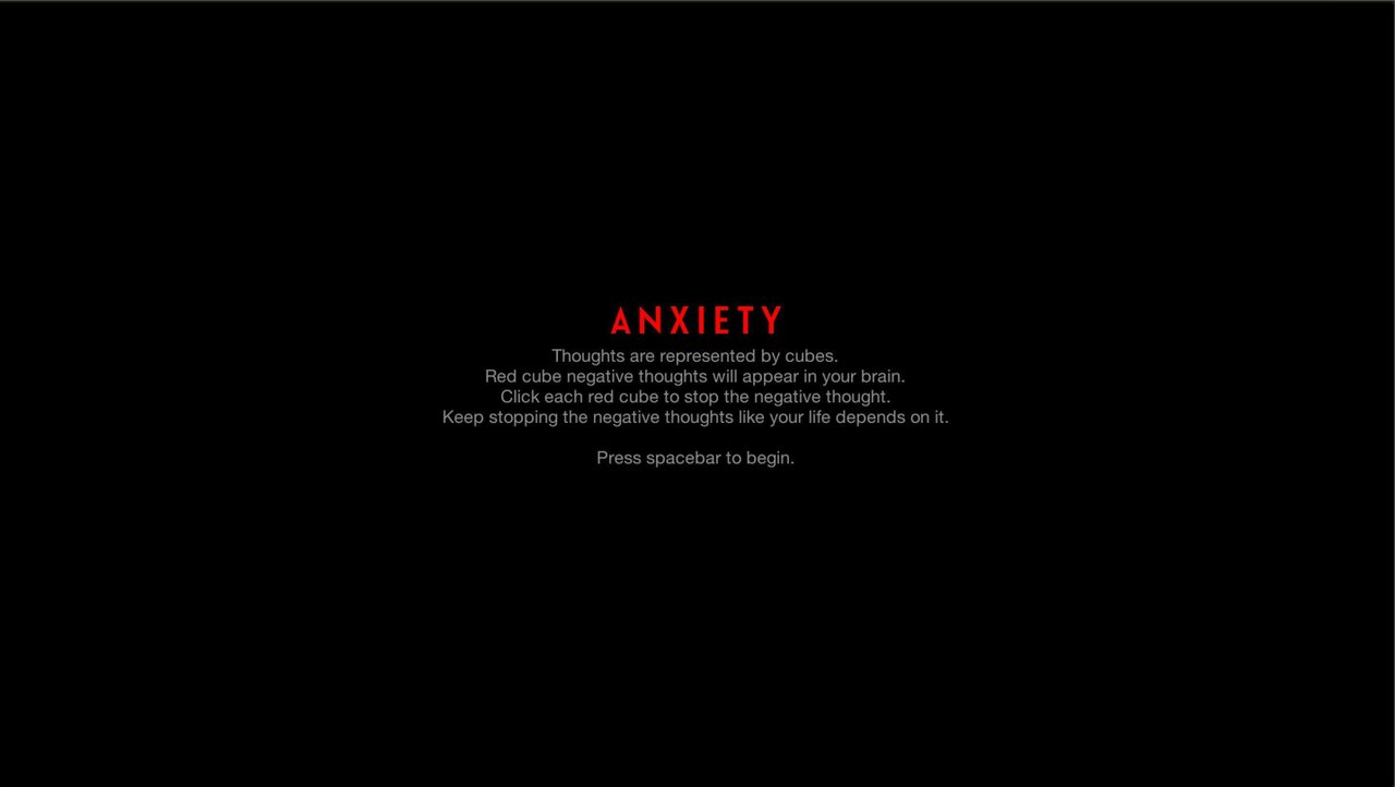 Anxiety is a game designed to foster empathy and awareness around anxiety disorders and mental illness as a whole. According to the National Institute of Mental Health, 31.1% of adults will experience an anxiety disorder during their lives. Anxiety attempts to show neurotypical people what someone who has anxiety might experience both while fighting and attempting to manage their anxiety.