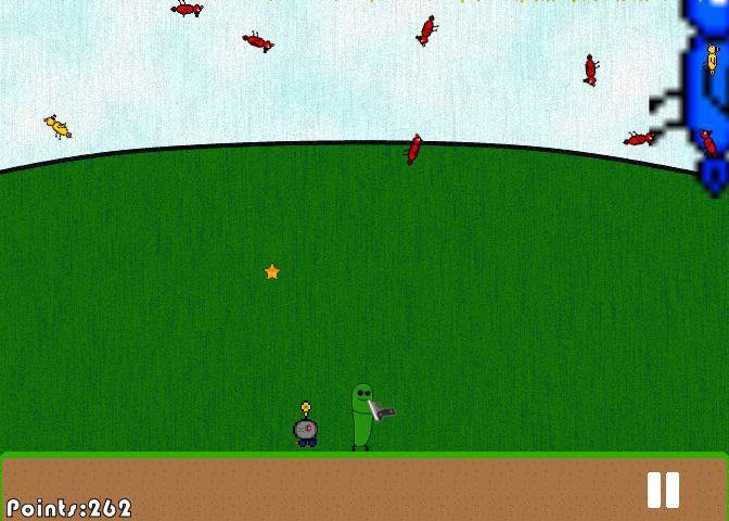 bird to achieve high scores. Over time the blue bird will grows which increases the difficulty. Every 40 seconds 1 of 4 different power-ups will spawn which you can shoot to either get a new gun, or a helper for 15 seconds.