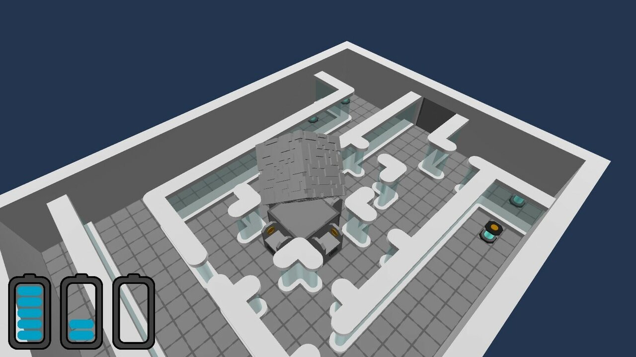 Your goal is to guide the robot through a maze and place batteries in charging stations to open the gate to the next level, before running out of battery.