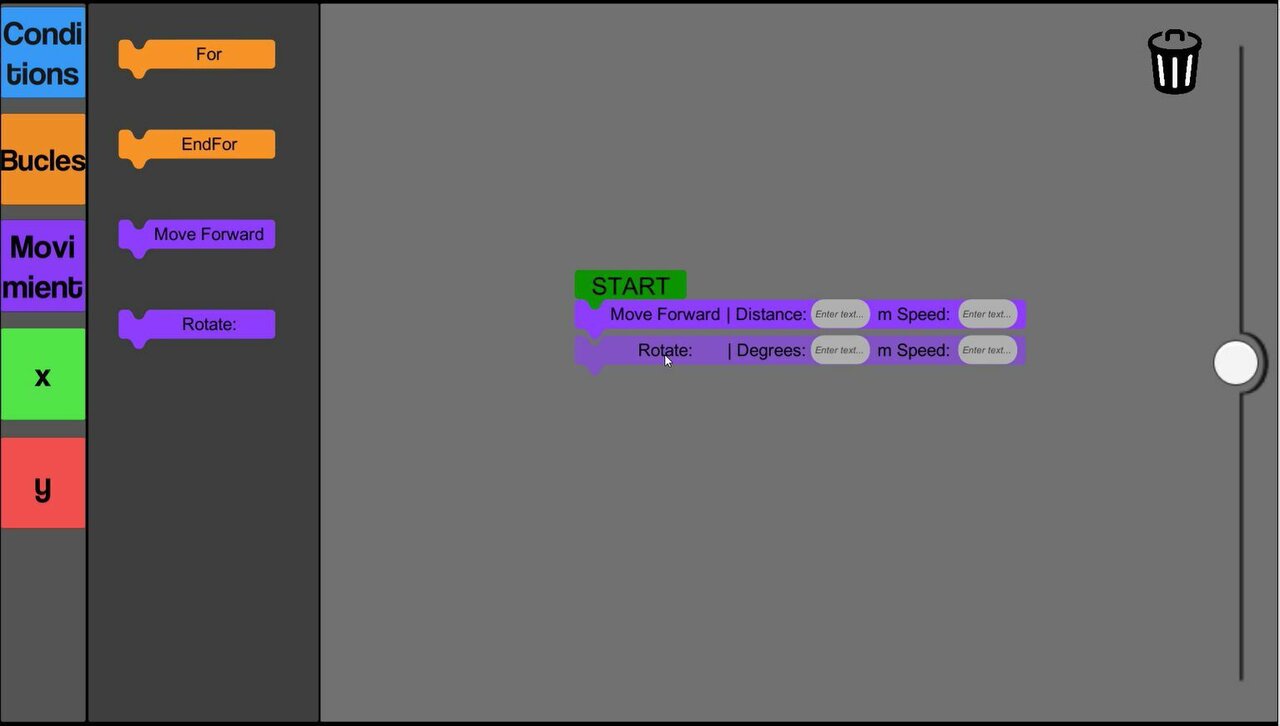 This gameapp let everyone program whatever object finds in the game wiht simple and visual code blocks. But what's special about our app is 2 things.