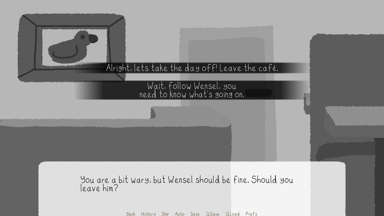 There's competition between two cafés in this world, and it's up to you to choose who to fight for. You're a spy from the Weasel Café, that needs to capture a recipe from a competing café, the Duck Café. Included in this game are multiple endings, long and short, bad and good, and it's up to you to choose which one to believe in.