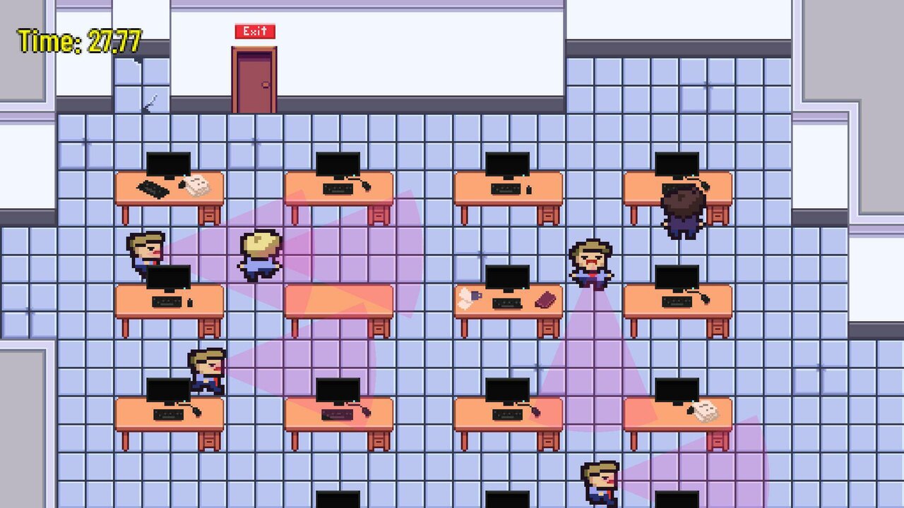 Your corporate project is falling behind schedule, so the management introduced a six-day working week. But who wants to stay in the office on Saturdays? Your task is to get out of your office without the managers noticing. Every time they catch you they will send you back to your desk and you have to start over. The exit door are locked and the key is placed on a desk at the other side of the office. Collect the key and escape through the exit door. Navigate your character using arrows or D-pad on a controller. Use space bar or controller A button to: