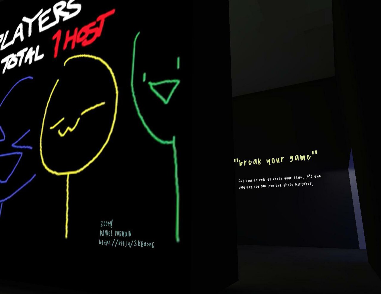 Fall Arcade is an annual tradition at the MICA Game Lab. With the lab closed due to the pandemic, we created a virtual gallery for this year’s show. Our inspiration was the lab itself; we set out to recreate it but, during that process, solid walls gave way to abstract spaces. That transition from physical to surreal is reflected in the layout – which will take you from an arcade-inspired gallery all the way to outer space! There are three spaces to explore: HELLO WORLD, ZOOM ROOM, and SPACEPLOITATION. The design of each room is defined by the works featured within.