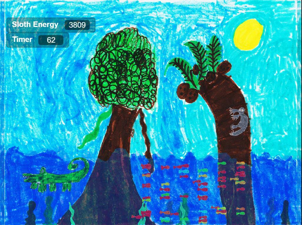 This game is a parent-child team project inspired on Thalassocnus spp., a group of semi-aquatic sloths that existed millions of years ago in what is now South America. The game is the first of a series themed on the interactions between herbivores, carnivores, plants, and energy, illustrating how herbivores balance grazing with escaping from predators (carnivores) and how such balance affects their net energy.