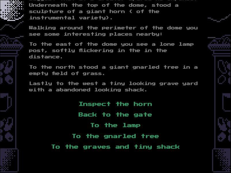 This short text adventure is a proof of concept I made to: Learn Ink, then see if I could make an adventure that had a central hub! Thus it is a short adventure in a dilapidated garden!