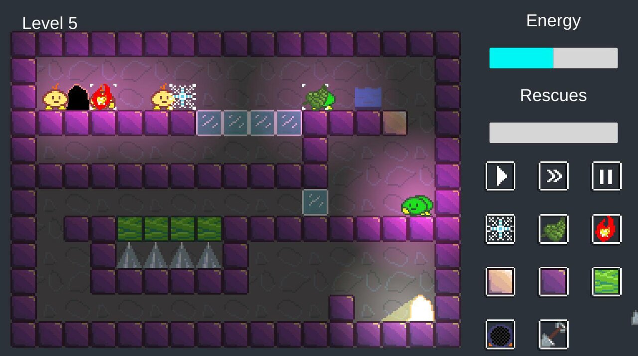 Use limited energy to place Elemental Powerups, Blocks, and Interactions that will help cute(?) creatures escape the cave and safely reach their home.