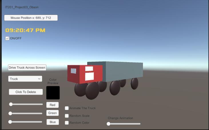 User is able to animate a truck prefab when pressing a toggle button as well as changing the speed of the animating movement with UI Slider. User is also able to run truck prefab around the screen by pressing a button.