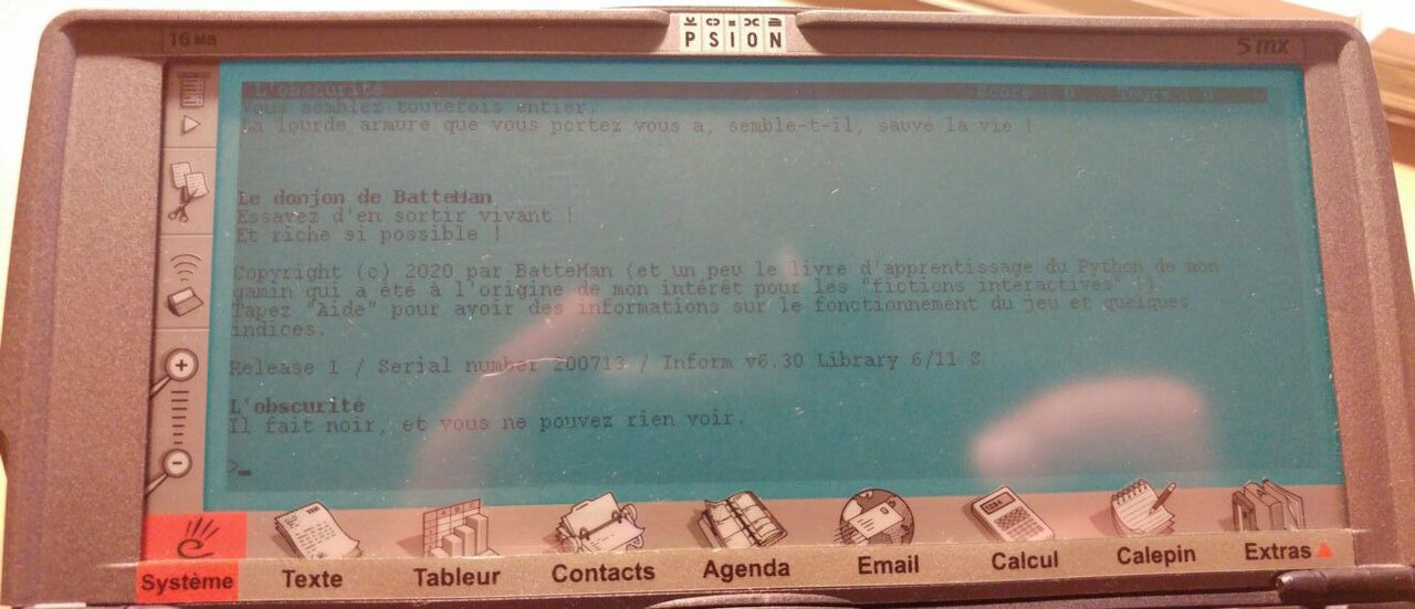 Cette fiction interactive (FI) a été créée par pur hasard. Tout a commencé par un livre d'apprentissage au Python que mon fils a reçu à Noël et dans lequel il apprenait à faire une mini FI avec un chevalier et un dragon, le tout à base de "IF" et de "ELSE". Trouvant l'idée sympa, j'ai alors enrichi ce script et, par un heureux hasard, Astrofra a voulu tester ce script sur Amiga avec une vieille version de Python ! Mon petit coeur s'est alors emballé de plaisir à l'idée de pouvoir jouer à MON jeu sur mon Amiga ! Là, il m'a parlé de RenPy, d'Inform, d'Infocom et de tout un tas de trucs dont j'ignorais l'existence et m'a renvoyé vers un certain Hugo Labrande, "un des darons de la FI française" m'a-t-il dit. Ce dernier, fort sympathique m'a conseillé d'utiliser Inform, les dés étaient jetés.