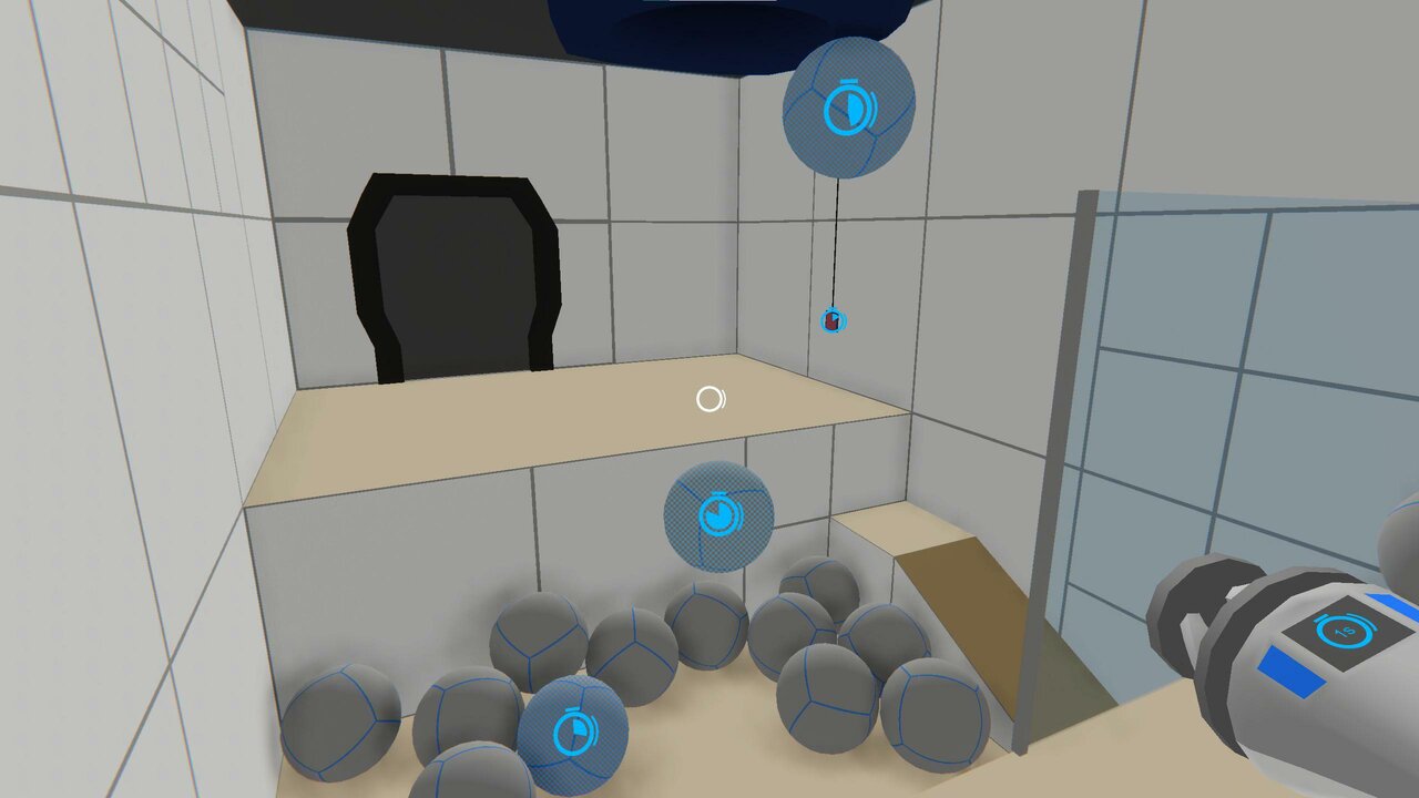 You can loop (almost) all interactive objects in the game: buttons, doors, pistons, conveyor belts, cubes and spheres. By looping an object, you make it repeat whatever it did in the last few seconds before you shot it. This goes on forever, until you stop the loop by shooting the object again. Looping objects will repeat every effect they caused in their loop, so buttons will continue to trigger, objects will move back and forth and doors will open and close. The length of the loop can be switched between 1s, 2s and 4s using the right mouse button. Use a combination of loops and reloops to solve the puzzles.