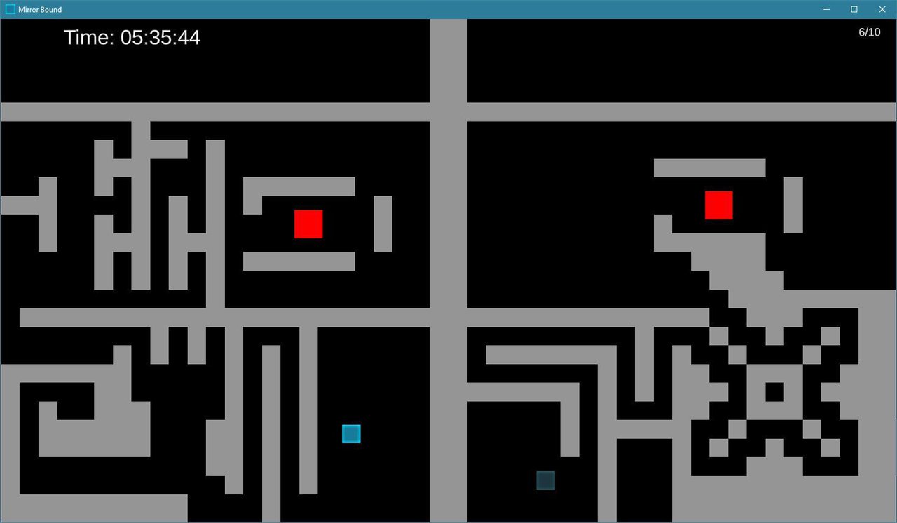 Mirror Bound is a simple 2D puzzle game where you try to move two characters into the target zone at the same time. The only problem is that one of the characters mirrors all of your movements! See if you can beat all ten levels, and challenge your friends to beat your fastest time!