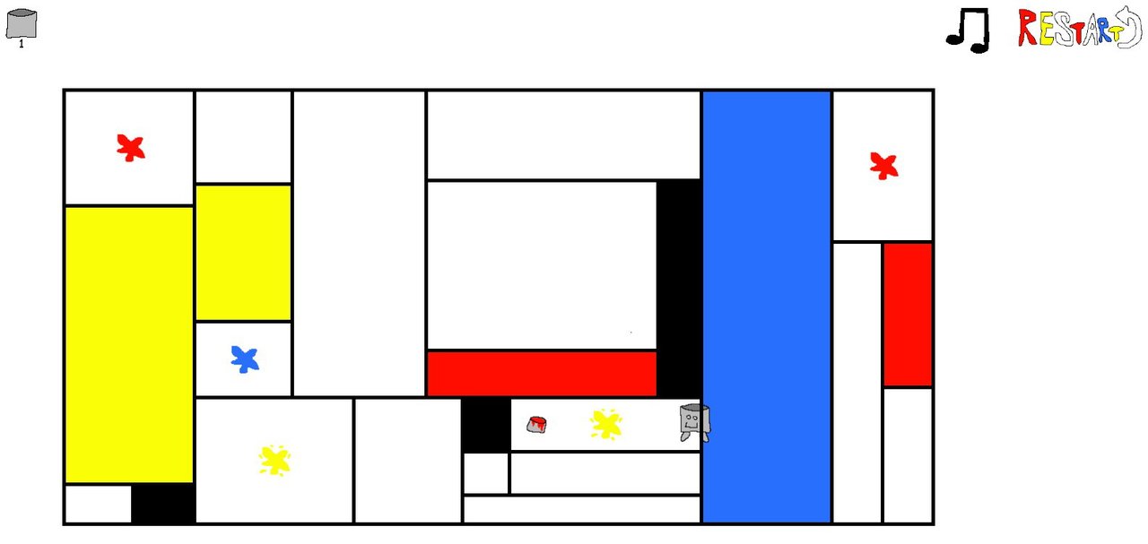 Help Bucky make some paintings! Move with the arrows or WASD. Click on the buckets on the top-left (or use the hotkeys 1 and 2) to collect the colour of the tile you are on, or empty the bucket in a white tile.