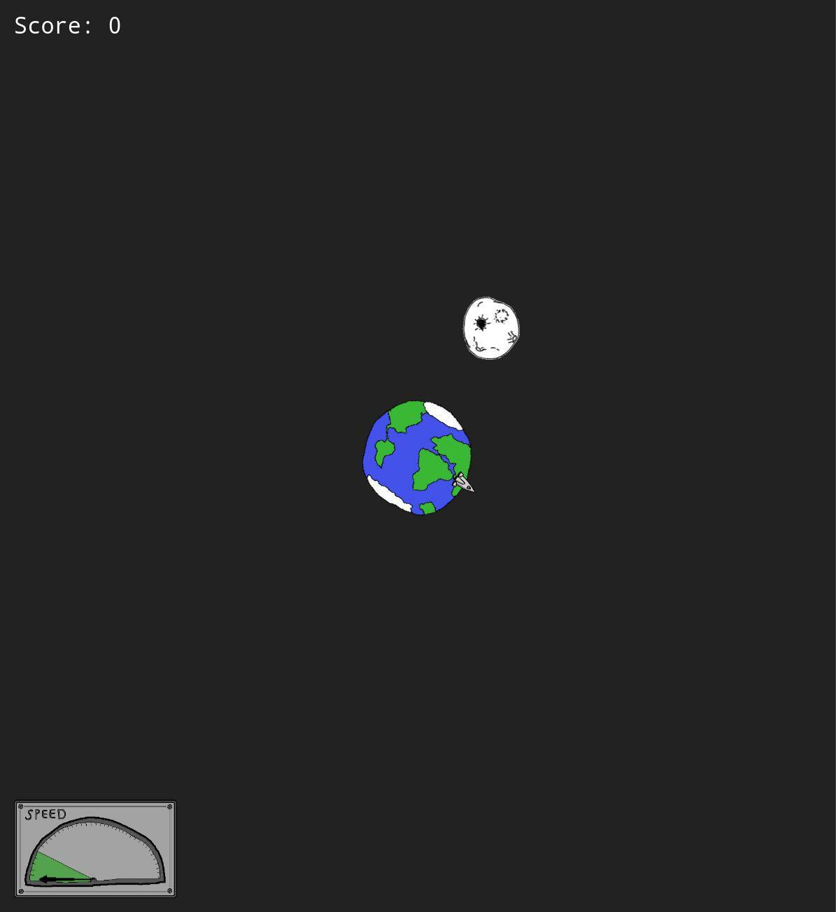 The game is available to play at https://trymunx.github.io/moonshot. To play, click and drag anywhere on the screen to launch the rocket. The angle at which you release the rocket will be the direction it is launched in, and the aim is to land on the moon. If you are travelling too fast (the speed is higher than in the green area on the speedometer), you will crash! To score a point, land safely on the moon without crashing by launching at an angle and speed that will take you close enough to just orbit the moon without crashing directly.