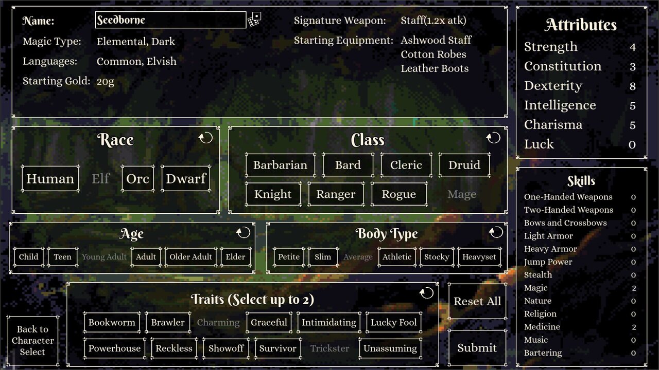 Build your character, starting with a D&D inspired character creator menu. Choose your class, race, age, body type, and character traits to determine your starting stats, signature weapon, and known languages.