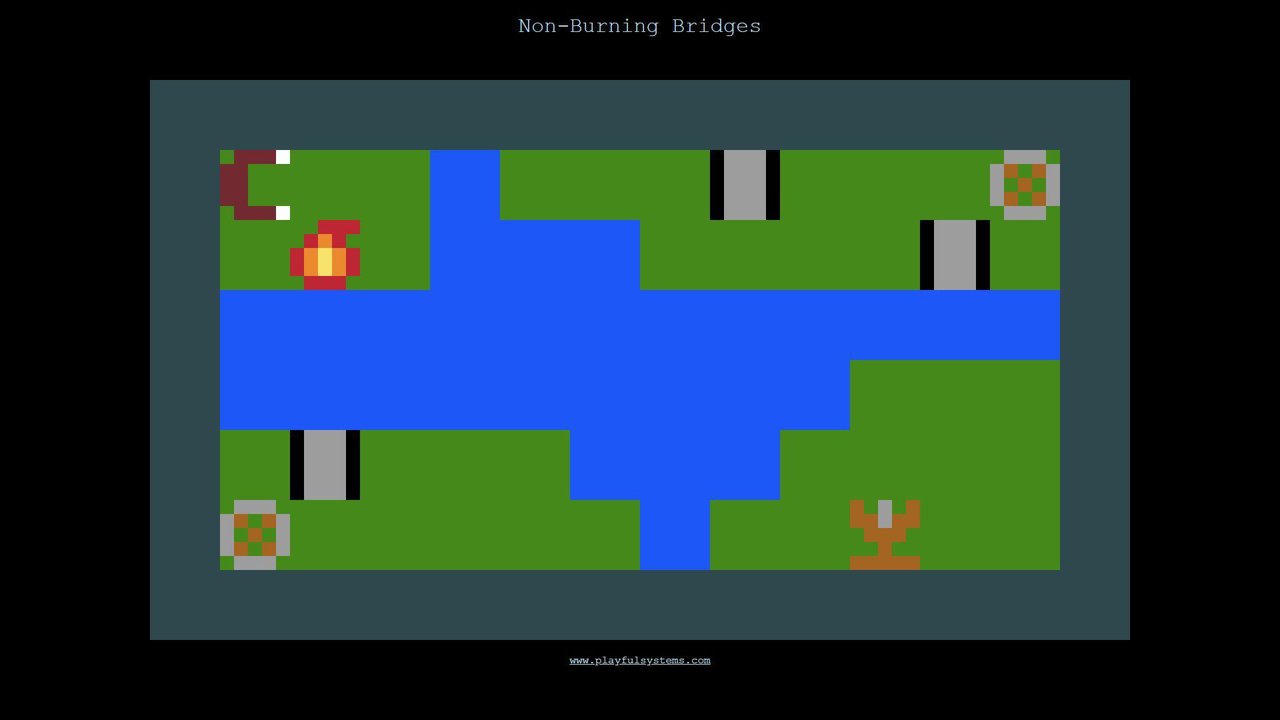 Non-Burning Bridges features the player magnet on its quest to return a flame to its rightful place upon an array of campfires. The magnet is capable of drawing metal bridges towards it in order to get the flame across dangerous pools of water. The magnet can push bombs around to level bridges to make way for more bridges and bombs.