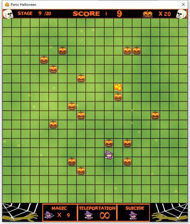 Halloween panic is a turn based survival horror puzzle. Magica was not paying attention and headed straight for the pumpkin patch. They are not very smart. They will run blindly towards Magica - sometimes crushed against each other or tripping over pumpkin porridge. Click on the arrows to move, click on Magica to stay put to advance the pumpkins. Click button to use MAGIC when the pumpkins are closest or use the TELEPORT button to take you to a random location. You can also use the SUICIDE button to make your last fight or lure the pumpkins on their porridge. Save Magica!
