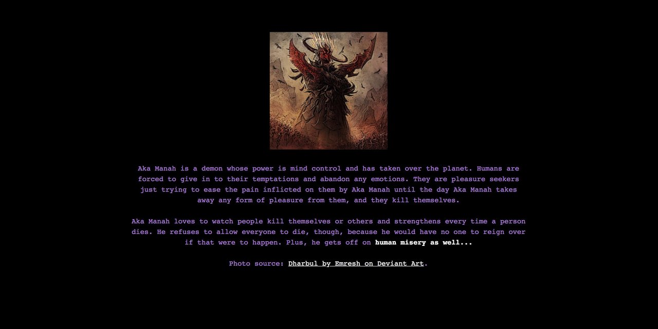 Possessing Aka is a short, one sitting, interactive fiction game about a kid named Jake who must take down the reign of Aka Manah, a demon who possesses the mind of everyone on earth, with the help of Planet Zu. Jake learns that emotions are one hell of a ride!