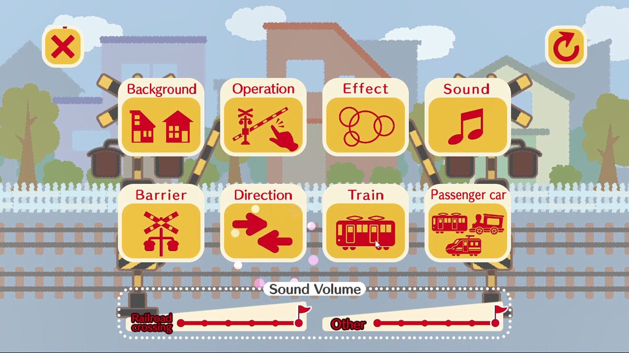 With "buttons," click the "crossing barrier," "conventional line," "bullet train," and "steam locomotive" buttons at the bottom of the screen (if using a controller, use the directional pad and A, X, and Y buttons).With "mouse," click on the screen with the mouse and the barrier will come down and the train selected (in the settings) will come running.