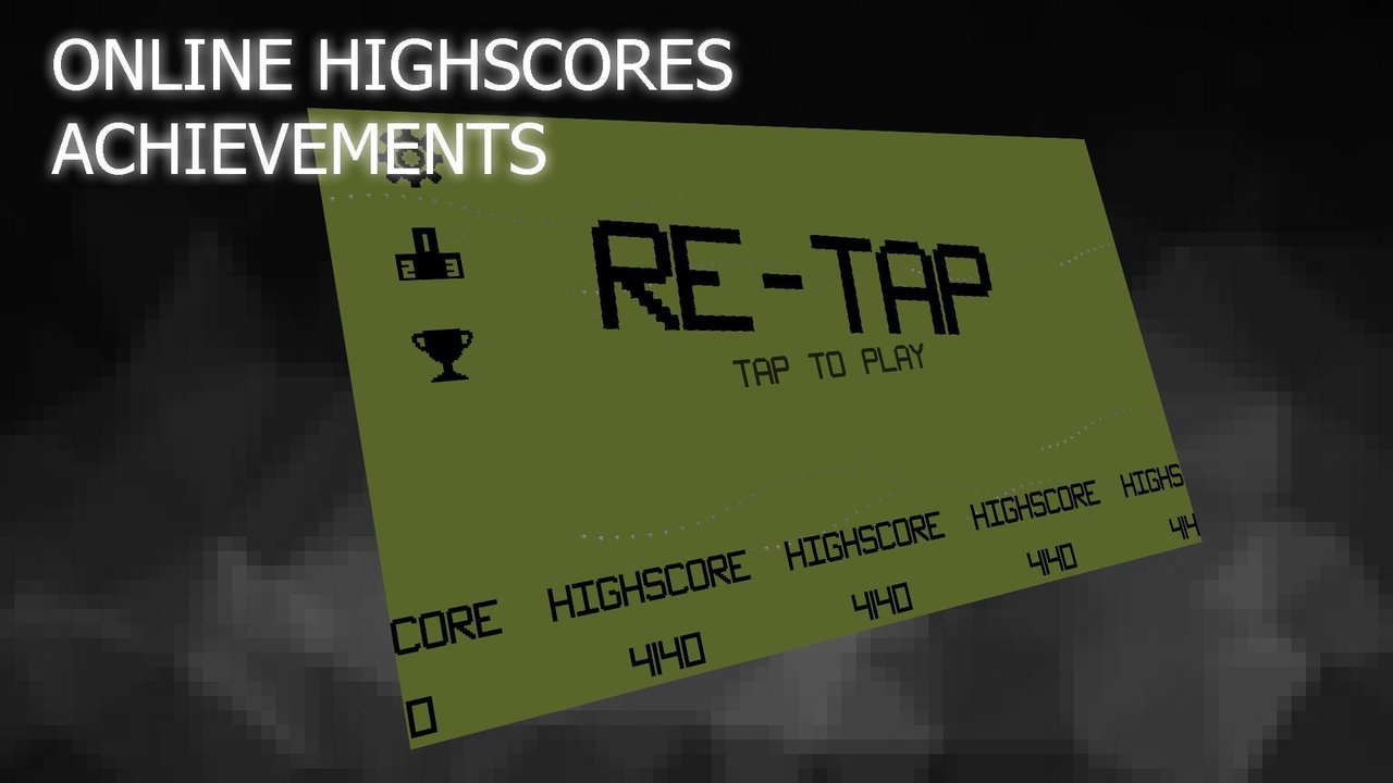 "Re Tap" is a modernized minimalism arcade game that focuses on the gamer's reflexes and quick decision making skills. Anyone from all ages would be able to play this game with no effort at all, but only the skilled will be able to place their name in the top 10. Unlock achievements for doing remarkable stunts, varying from easy to a bit more obscure.