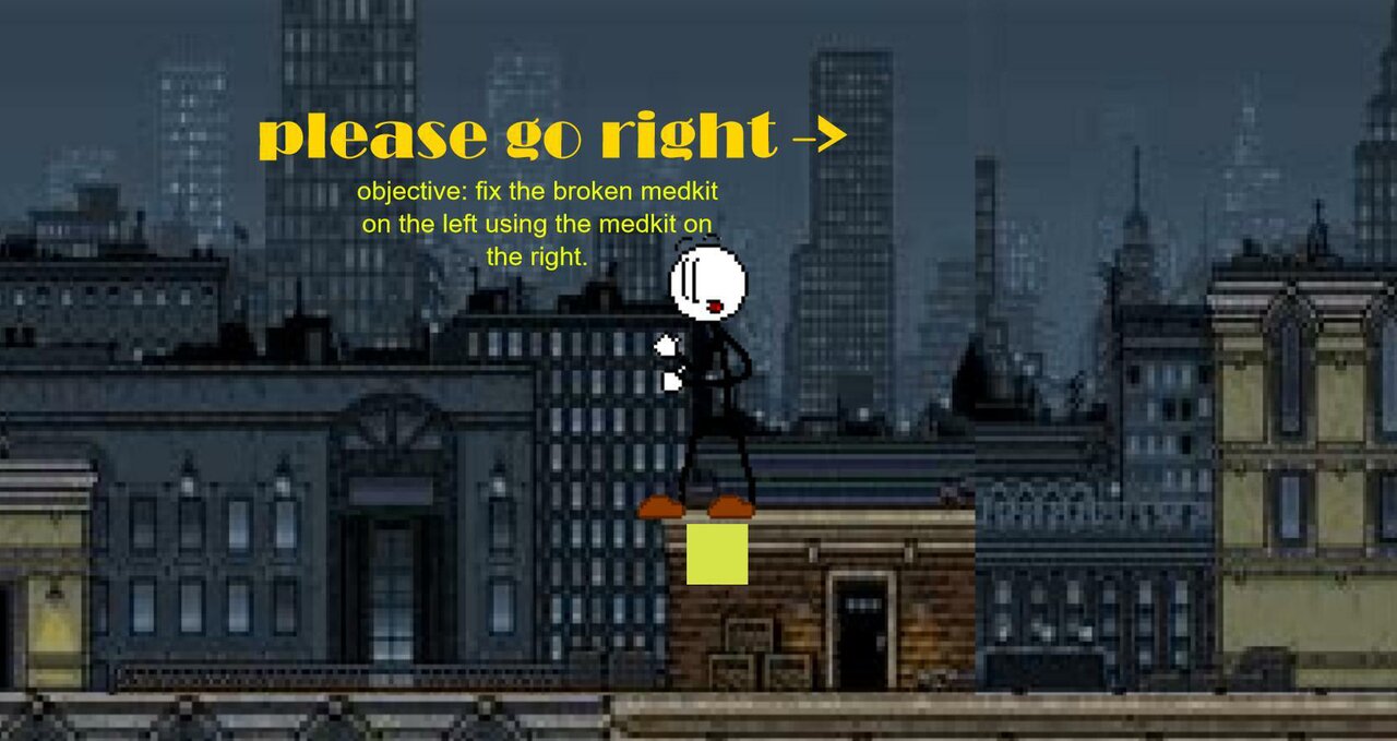 dive in as henry the stickman, collecting a medkit to fix another medkit. now that the other medkit is repaired, fix the medkit with the new medkit that you just repaired using the medkit thats now broken (indicated by the X in the medkit).