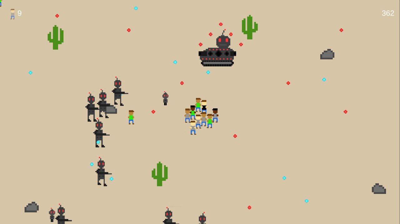 Trapped in the desert, people are being forced to fight for their lives against blood thirsty robots. In this crowded bullet-hell, how long can you keep your crowd alive?