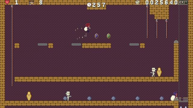 性能の異なる二人のキャラクターを操って、画面内の宝物を全て集めてゴンドラで脱出すればステージクリア。