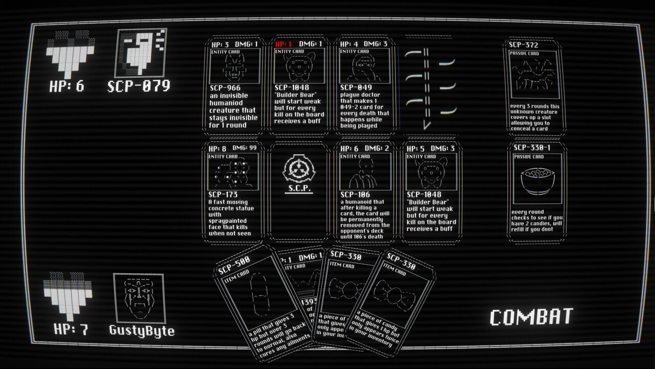 The game has a turn based structure in which both you and 079 will place down one entity card and one item card per turn. Afterwards, the cards enter the "combat" stage, in which every card on the board, from top-left to bottom-right, will use their abilities. Some cards have special abilities, other cards can be stacked to build up their stats, known has horde cards.