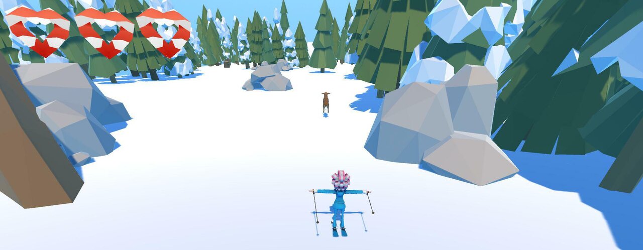 You play as the dog pulling your elderly owner down a ski slope. She wanted to participate in the sport of Skijoring but she's not the most sprightly so it's up to you to keep her safe! Don't hit any obstacles!