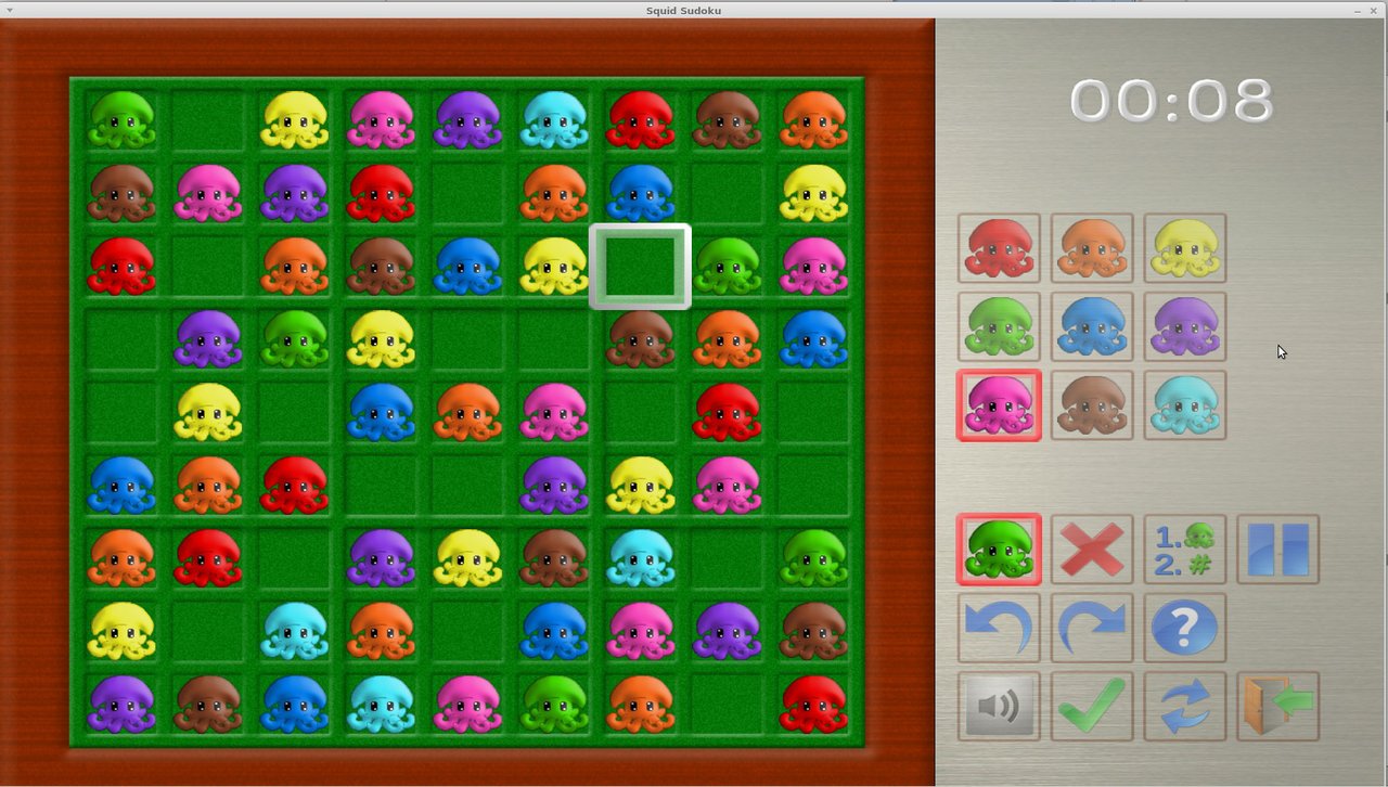 Two Squid Games brings Anime style cute squids to the Japanese classic number puzzle game of Sudoku. You can play with the classic numbers 1-9, or switch to colorful Squid tiles in the game options. Whether you want to play Sudoku with numerical digits 1-9 or with red, orange, yellow, green, blue, purple, pink, brown, and turquoise -- we are proud to present one of the best electronic Sudoku games ever written.
