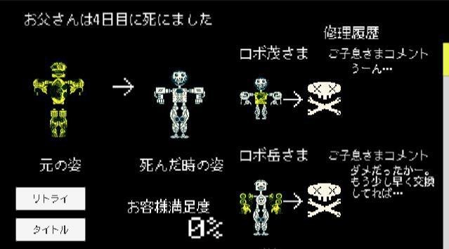 プレイヤーは修理を求めてやってくるお客さんを対応しながら、お父さんも修理しつつ長生きさせます。 お客さんとお父さんには、故障パーツ箇所が表示されています。 プレイヤーはスクラップエリアから、なるべく元の形と色のパーツを選んで差し替えてあげます。