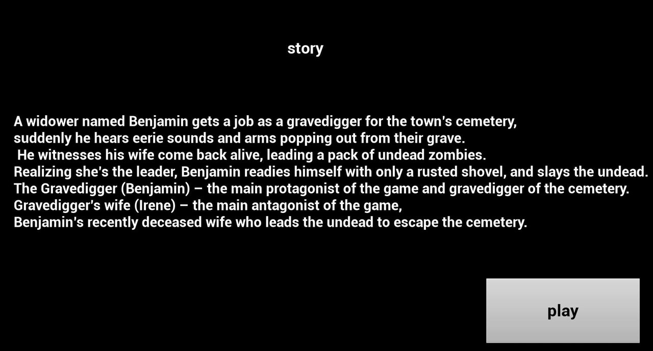In Super Shovel Fighter you play as a gravedigger, armed with his trusty shovel, fighting the undead. A fiendish demon has brought back your pervious clients including your wife! You must fight through Zombies, Skeletons, possessed birds and bats to reach the demon. After you defeat him there is only one thing left to do, put you wife to rest again.