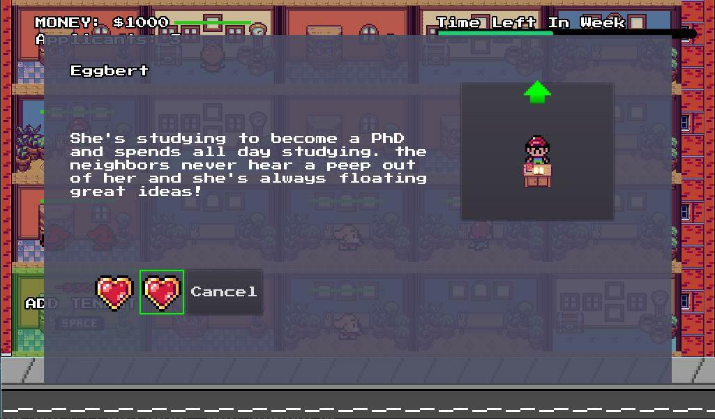 - If you run out of money, it's game over! How many weeks can you survive and how much rent can you make?