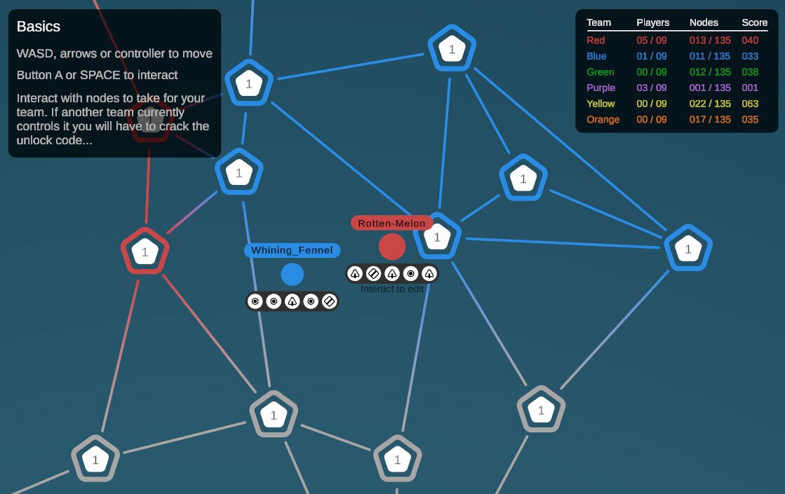 Use WASD, arrows or a controller to move. While close to a node, press button A or SPACE to attempt to take over a node for your team. If it belongs to a different team you have to figure out the code they set to lock the node.