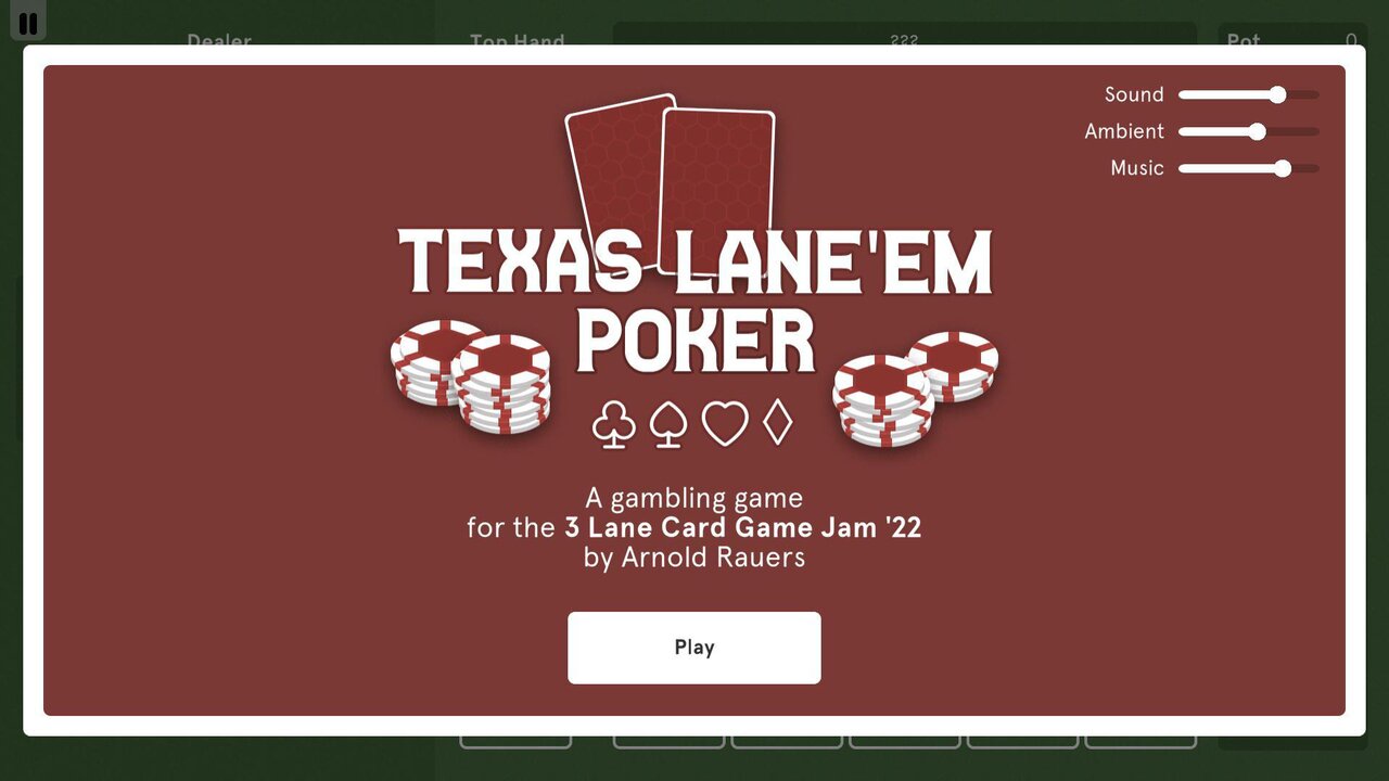 Play Texas Hold'em Poker on 3 different lanes against the dealer. Win hands to gain enough chips for the next rounds buy in. How many rounds can you survive?