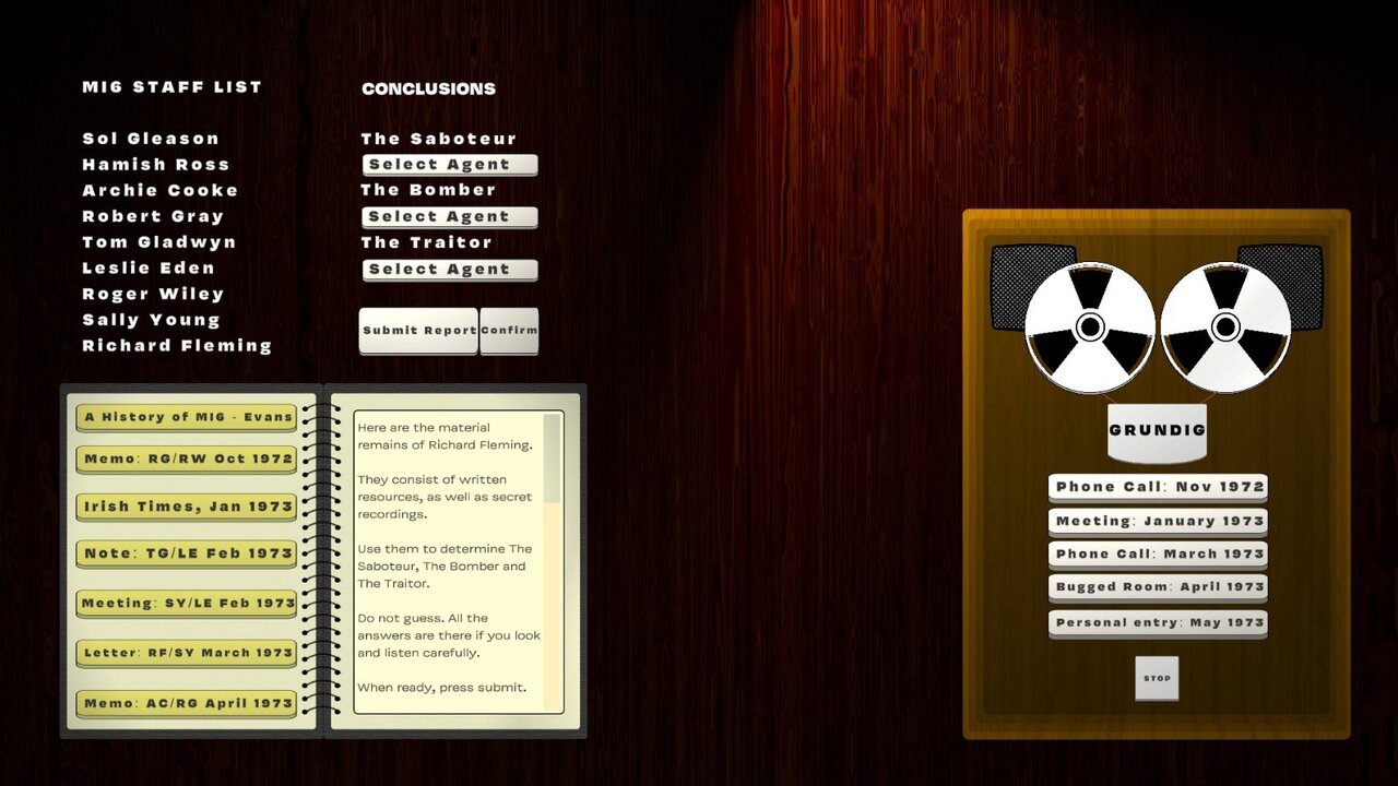 This game is obviously enormously inspired by the work of John LeCarre and Graham Greene. If you enjoyed it, I suggest you seek out their novels and adapatations for TV and Screen.