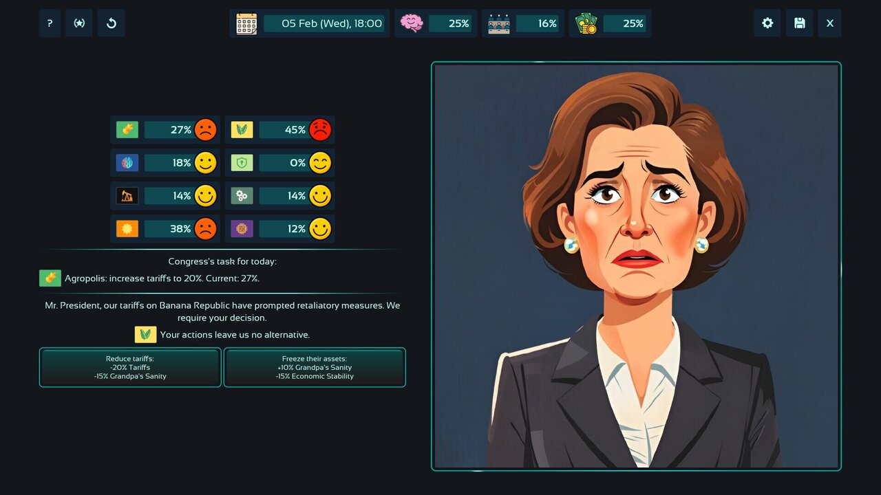 Your goal is to maintain a fragile balance between your sanity, the support of Congress, and economic stability. Review incoming bills to gain the approval of politicians. Avoid targeted strikes on the same countries — their retaliatory sanctions could crash your economy. Remember: every action has consequences!