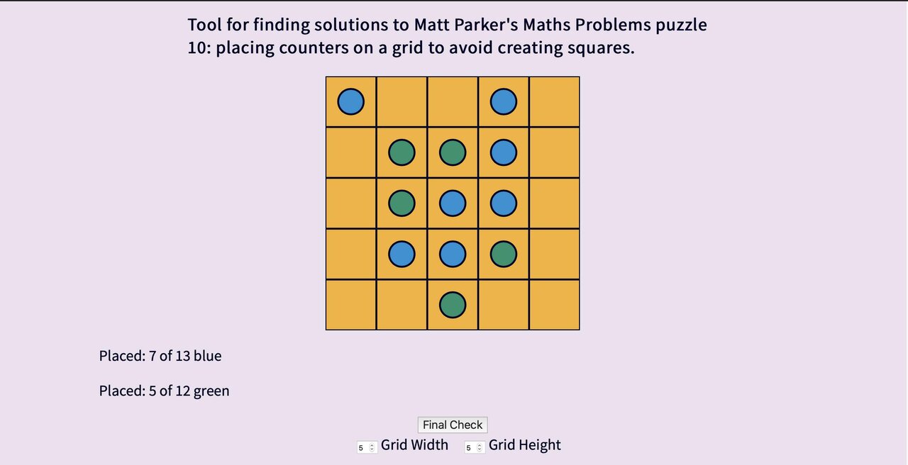 Matt Parker's Maths Problems puzzle 10 is to place counters on a grid so that no 4 counters of the same colour form a square. This is a javascript version to make identifying and avoiding the squares easier.