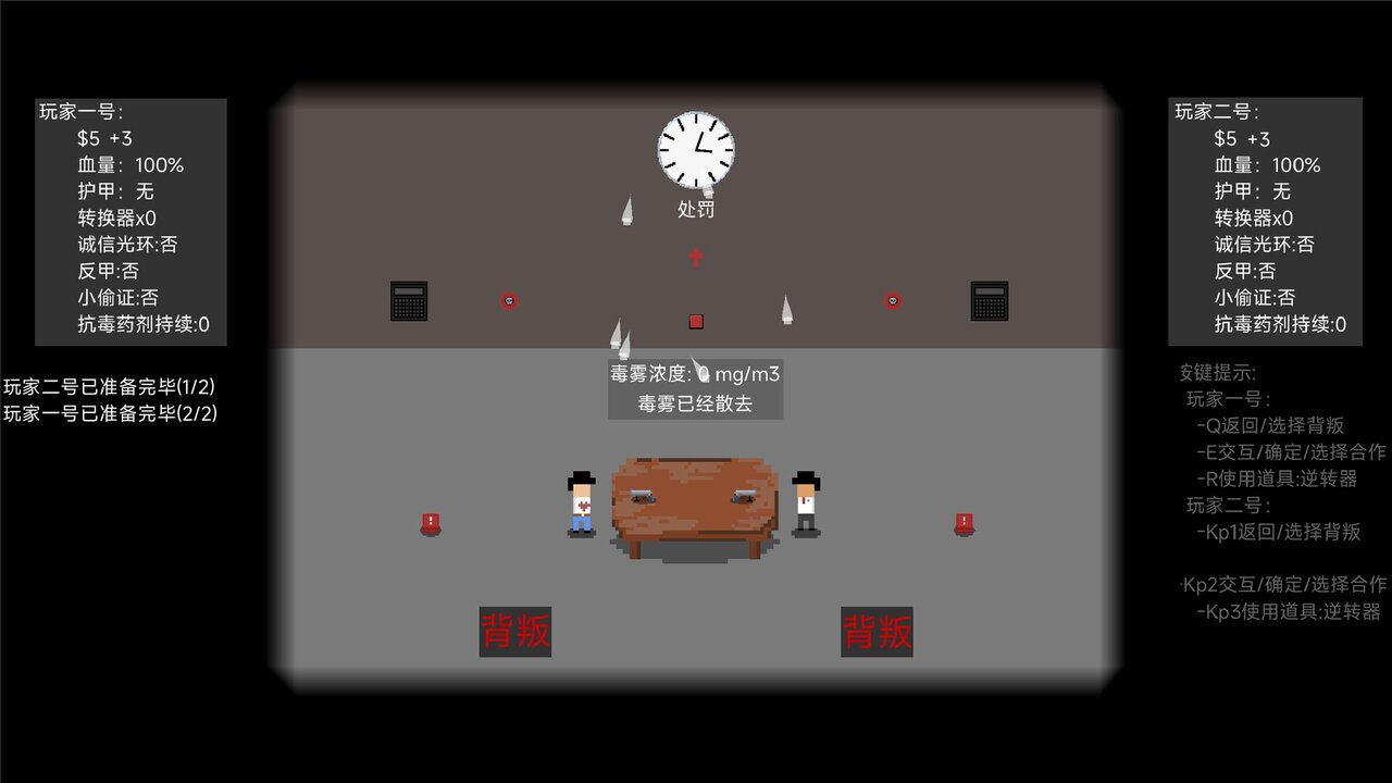 If one cooperates and the other betrays → The betrayer seizes a large amount of ¥, while the cooperator may suffer gunshot wounds (health loss/death).